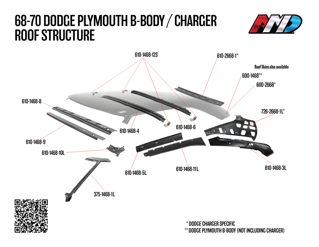 AMD now offers complete A-pillar component coverage for 1968–1970 Dodge and Plymouth B-Body models, including the Charger, Coronet, Super Bee, Satellite, GTX, Belvedere, and Road Runner. With the addition of the Windshield A-Pillar Lower sections, restorers finally have access to all three critical components needed to fully rebuild this vital structural area—inner, outer, and lower.