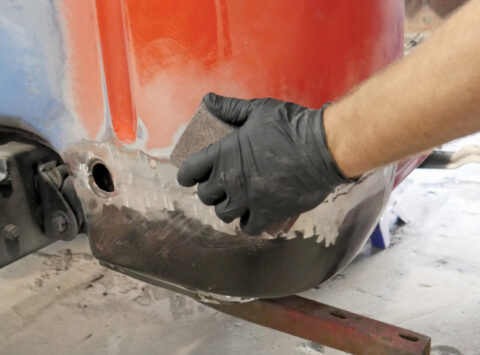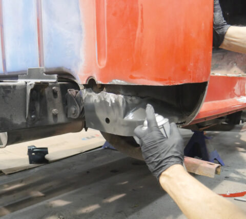 - Rear fenders were lined with protective coating, then sanded for sealer and color.