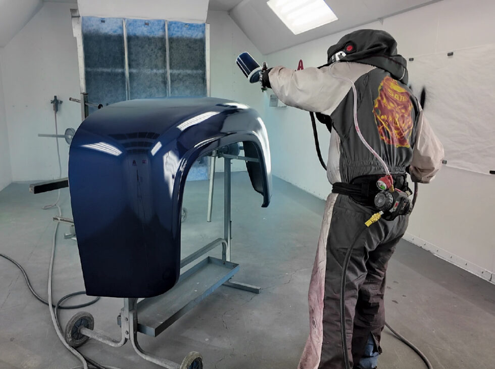 - Cab and misc parts headed into the booth; careful staging made full coverage possible in one session.