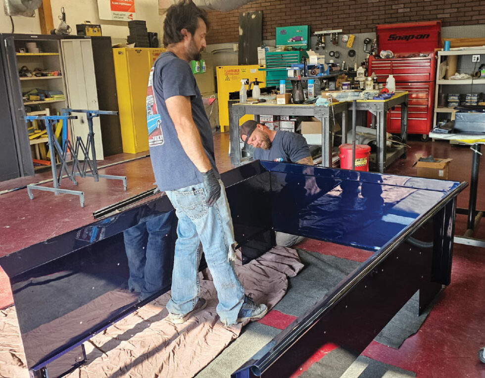 - Door bottoms received fresh metal repairs while paint pieces were prepped.