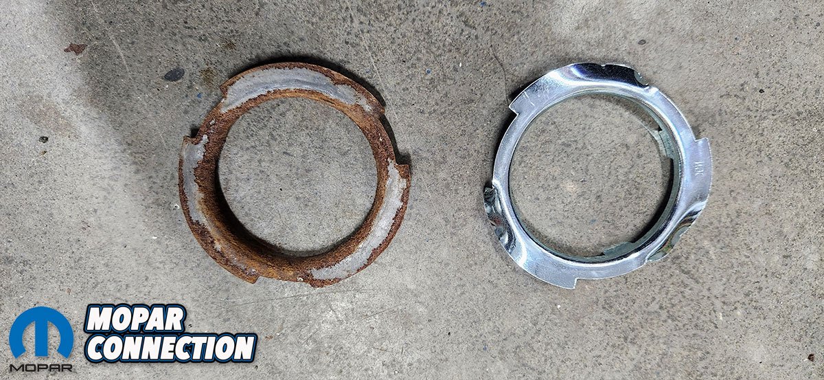 Since our Challenger now has a 440 Magnum under the hood, we upgraded to a 3/8″ line which meant we went for the 3/8″ fuel sending unit. The sending unit was very good quality versus some of the other reproductions we’ve seen. We have always heard that the factory lock rings for the sending unit are thicker and fit better than the reproduction ones so while we used the new sending unit and gasket, we cleaned up and reused our factory lock ring for a tighter fit. We did try the reproduction one briefly and wasn’t a huge fan of the fit.
