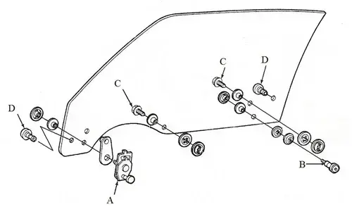 26. There are two glass adjustment points in the door: (A) (in middle of door) adjusts the window tilt from back to front and (B) adjusts the window front to back. |