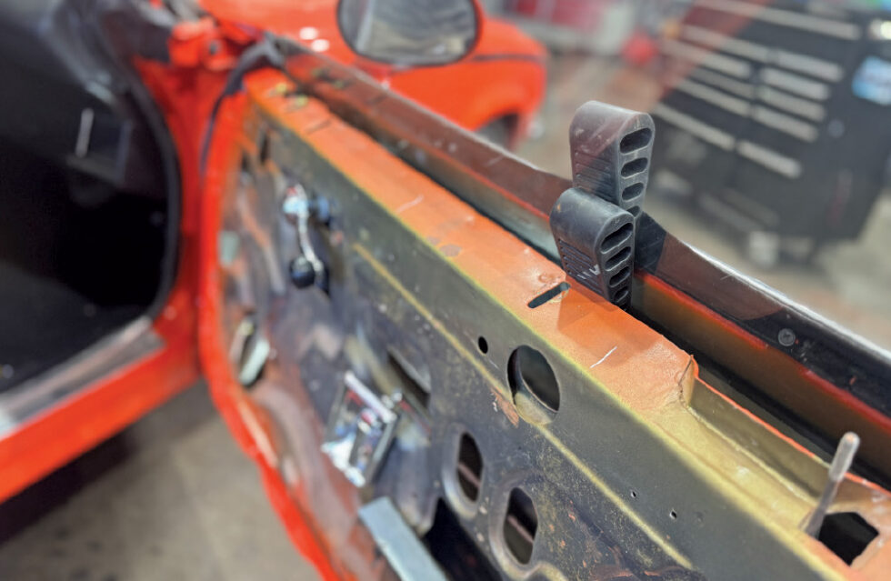 27. Next to go in are the three new window adjustment door felts on top. These adjust the window depth and double as window guides for smooth up and down operation. Getting the windows adjusted takes a bit of patience, but with some time you’ll get those windows right where you want ’em. |